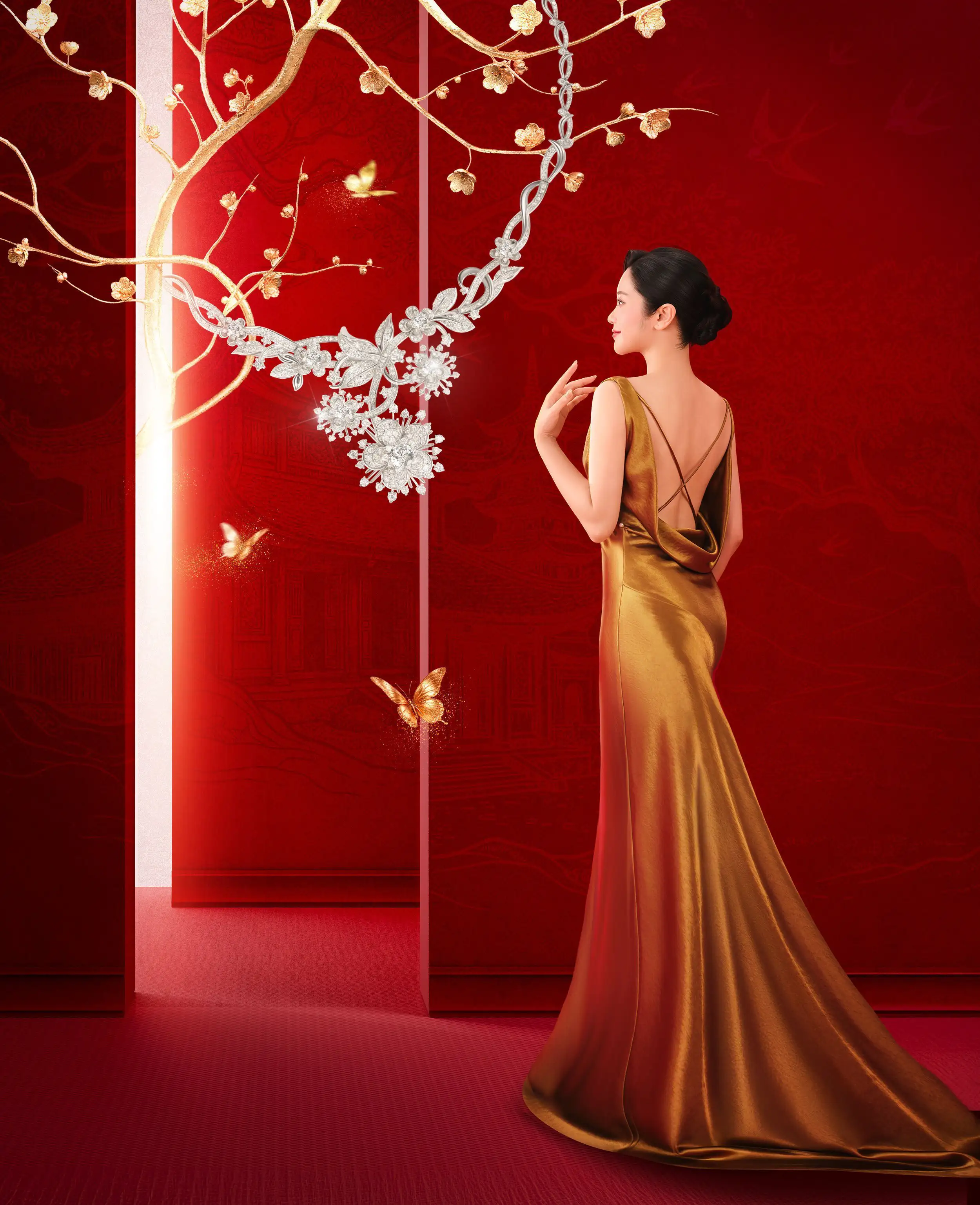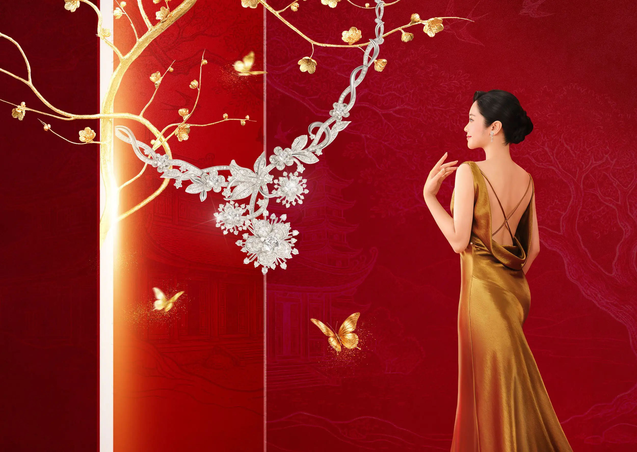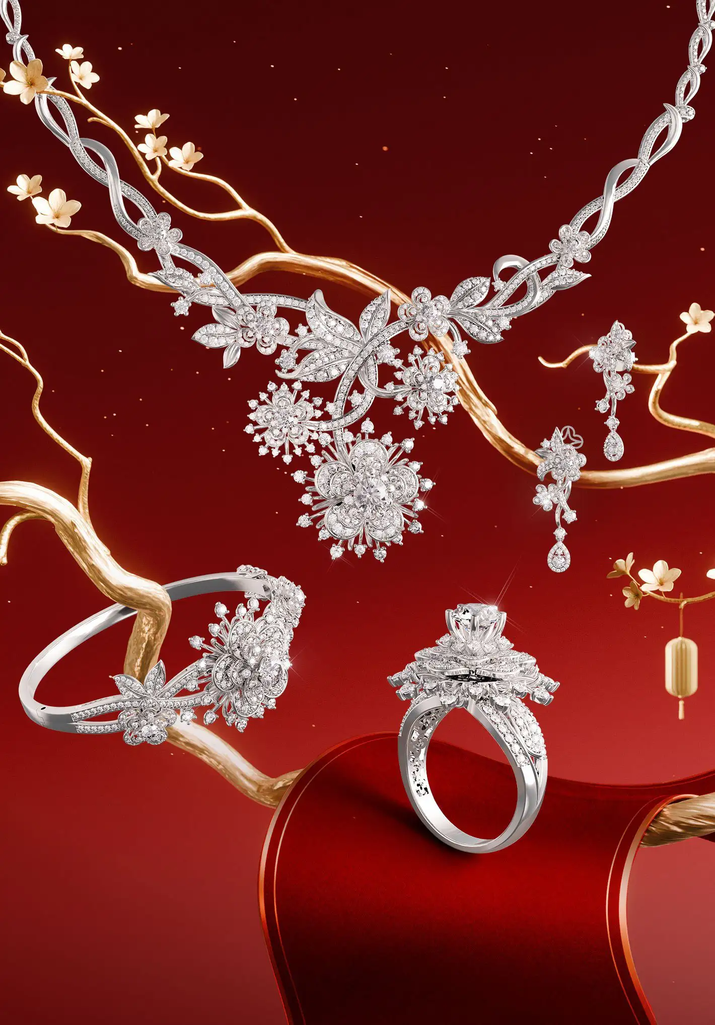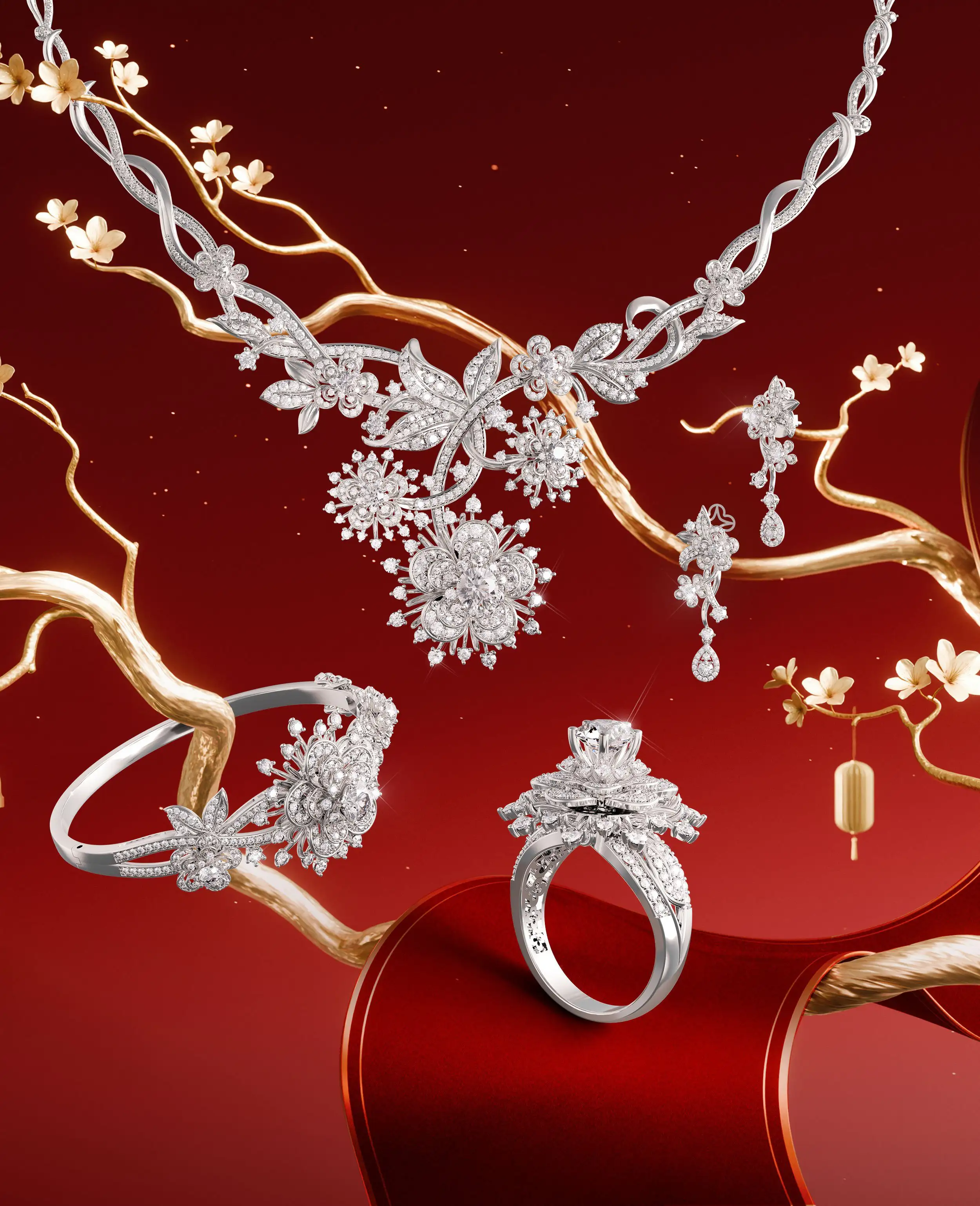 Bộ sưu tập Hoàng Kim Khởi Vận là chương huy hoàng nhất của mùa xuân. Đó là thời khắc mãn khai - khi “hoa chồng hoa”, trùng trùng điệp điệp như vượng khí hội tụ và thăng hoa.